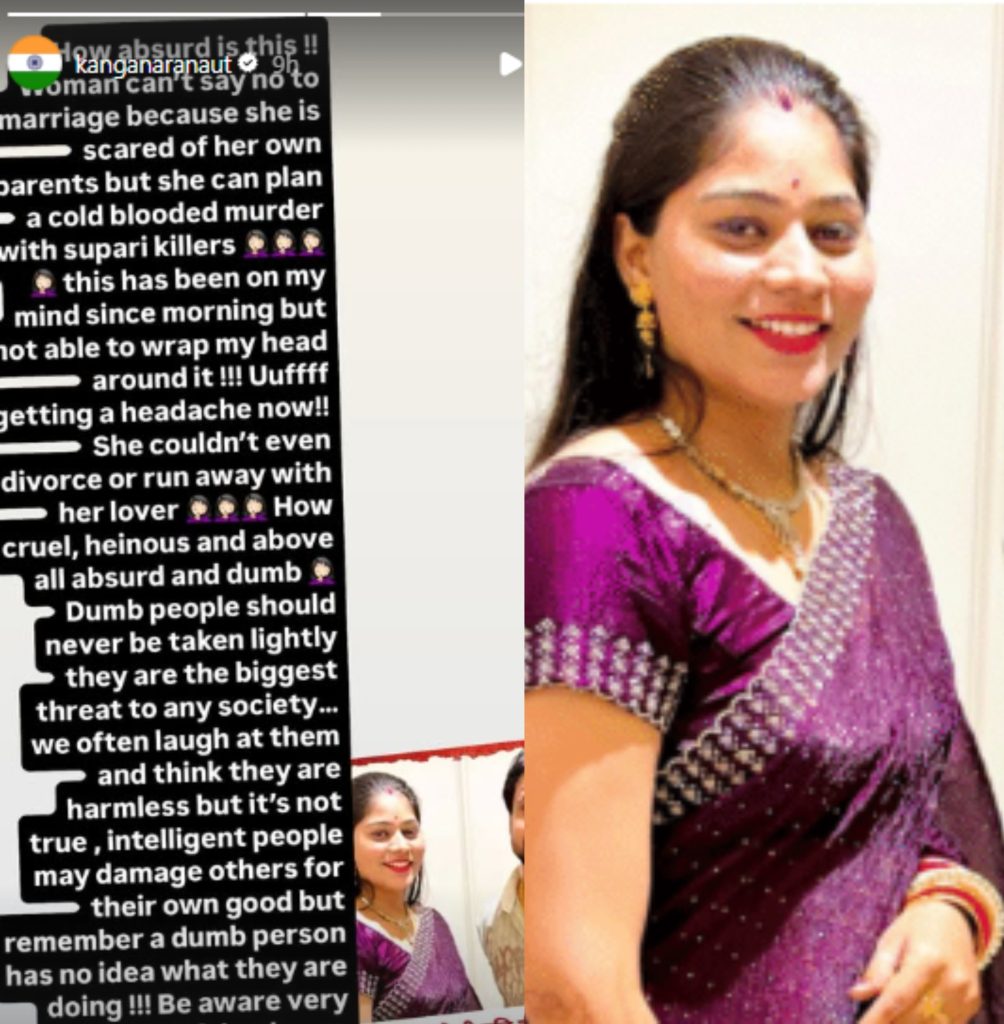 इस मामले में कंगना की प्रतिक्रिया सोशल मीडिया पर तेजी से वायरल हो रही है। उन्होंने इसे न सिर्फ क्रूर और अमानवीय बताया बल्कि समाज के लिए सबसे खतरनाक करार दिया है। कंगना रनौत ने इंस्टाग्राम पर एक लंबा पोस्ट शेयर कर इस पूरी घटना पर अपनी नाराजगी जाहिर की। उन्होंने सवाल उठाया कि, एक लड़की अपने माता-पिता से डरकर शादी को मना नहीं कर सकती, लेकिन अपने प्रेमी के साथ मिलकर पति की हत्या की साजिश रच सकती है? उन्होंने लिखा कि, ऐसी मानसिकता समाज के लिए बहुत बड़ा खतरा है और इसे हल्के में नहीं लेना चाहिए।